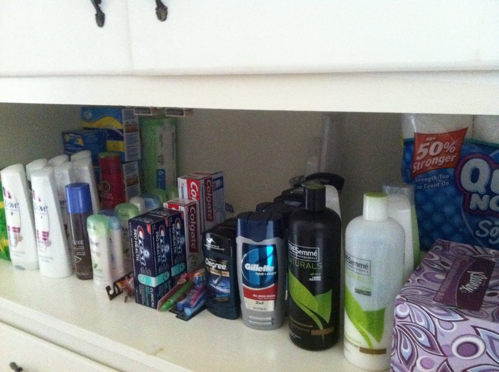 This is my bathroom stockpile.  Everything is arranged by expiration date.  The left half is my stuff and the right is the hubby's side.